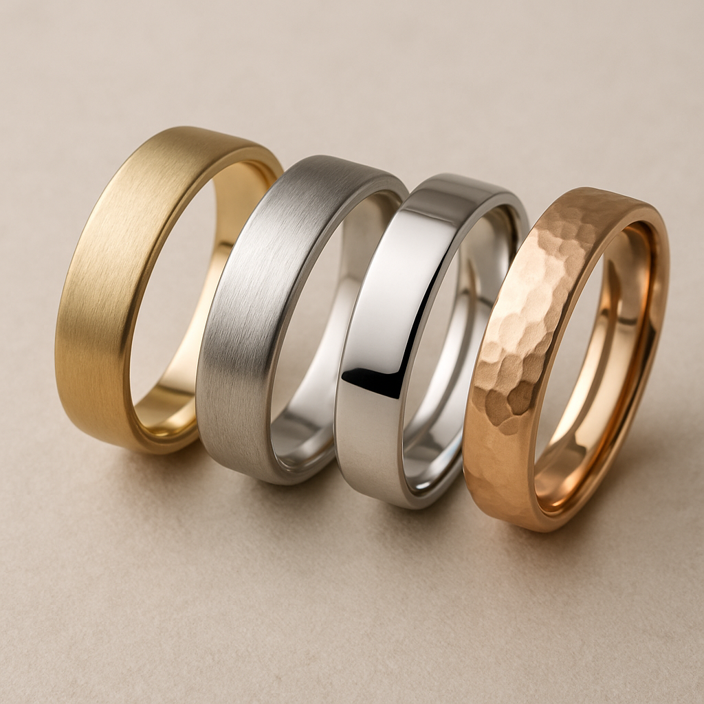 Textured finishes such as brushed, matte or hammered effects add individuality, while polished surfaces offer a classic, timeless feel. Engravings, diamond highlights and mixed metal designs can introduce a personal touch that makes your ring one of a kind.